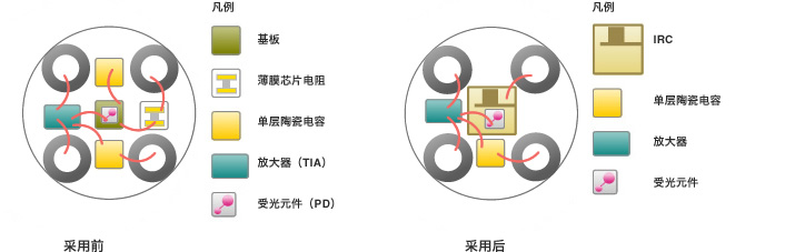 在構(gòu)成光通信系統(tǒng)的設(shè)備承擔(dān)受光部的器件中,使用了各種零件。主要的零件為受光因子(PD)、放大器(TIA)、薄膜芯片電阻、單層陶瓷電容。特別是為了去除雜音,提高受光因子的靈敏度,薄膜芯片電阻及單層陶瓷電容起了非常重要的作用。