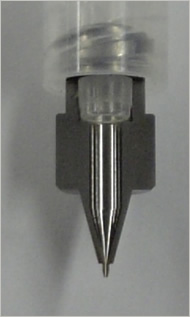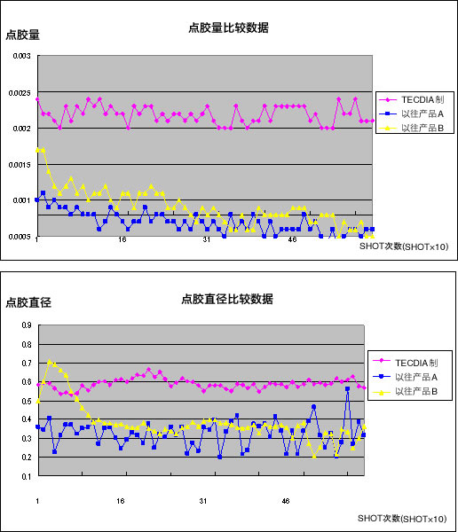 有關(guān)粘合(粘貼)材料內(nèi)發(fā)生的混合比例的瞬間變化,TECDIA通過對調(diào)劑時壓力變化的判斷,認為必須解決調(diào)劑時的壓力才是重點,然后嘗試開發(fā)出使壓力難以產(chǎn)生的,"可提高材料流動性"的點膠針頭。