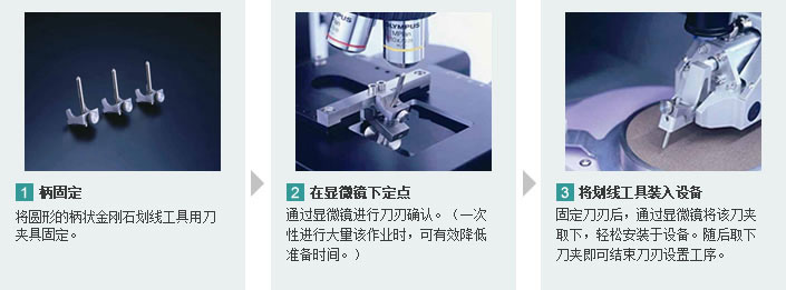以前,使用圓形柄(軸)頂點刀鋒形成的金剛石劃線工具時,要準確找刀刃是非常困難的。因此,一般情況下,客戶通過目視花時間去對準,或者用別的工件先進行試劃后才正式操作,既費時又費神。該作業(yè)對作業(yè)人員的熟練度要求很高,因此品質難以維持。當然,不僅耗時,還增加其它材料的消耗成本。