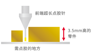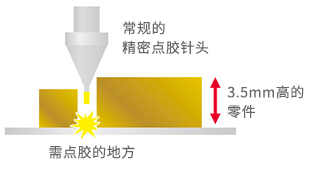 作為解決方案,點膠針的最前端必須要高于旁邊的零件,至少達(dá)到4.5mm以上。因為組建方式和標(biāo)準(zhǔn)頂針,內(nèi)部存在段差,會發(fā)生材料堵塞和硬化。所以在維持能夠?qū)?xì)小的地方進(jìn)行穩(wěn)定的精密點膠這一性能的基礎(chǔ)上,非常需要前端加長的新型點膠針。
