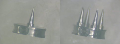 微型頂針有各式各樣的形狀和用途。本次開發(fā)的案件是在醫(yī)療器械的前端安裝微型頂針,固定在患者的頭皮處,通過微電流起到止痛的效果。醫(yī)療用機械必須是高品質(zhì)的。不僅在醫(yī)院能由專業(yè)人事為患者操作,患者也能自己在家使用。為了能夠?qū)崿F(xiàn)這一想法,并且考慮到非專業(yè)人士操作時頂針刺入頭皮的痛感,刺入前端極細才能滿足?,F(xiàn)在市場上在流通的針頭,瑞士制造的市場占比很大,加工費和材料費非常的昂貴。