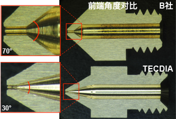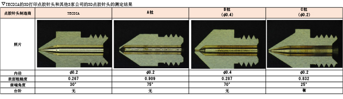 前端角度越鈍,阻力越大。B公司生產(chǎn)的3D打印點膠針頭的角度為70°,被認為阻力很大。可實現(xiàn)超微細點膠的精密針頭角度一般設置為30°,而TECDIA生產(chǎn)的3D打印點膠針頭的角度也為30°,點膠材料容易流動,有助于實現(xiàn)精密點膠。