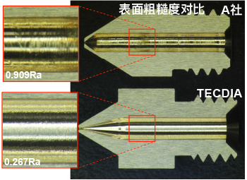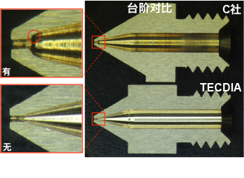 由于前端筆直部分有臺階,因此容易產(chǎn)生不規(guī)則流動。臺階的作用在于將前端角度加工成銳角時,防止刀具折損,這在一般的精密針頭中很常見。由于C公司生產(chǎn)的3D打印點膠針頭有臺階,因此很容易產(chǎn)生不規(guī)則流動。TECDIA生產(chǎn)的3D打印點膠針頭,雖然前端角度小,但由于沒有臺階,因此不易產(chǎn)生不規(guī)則流動。