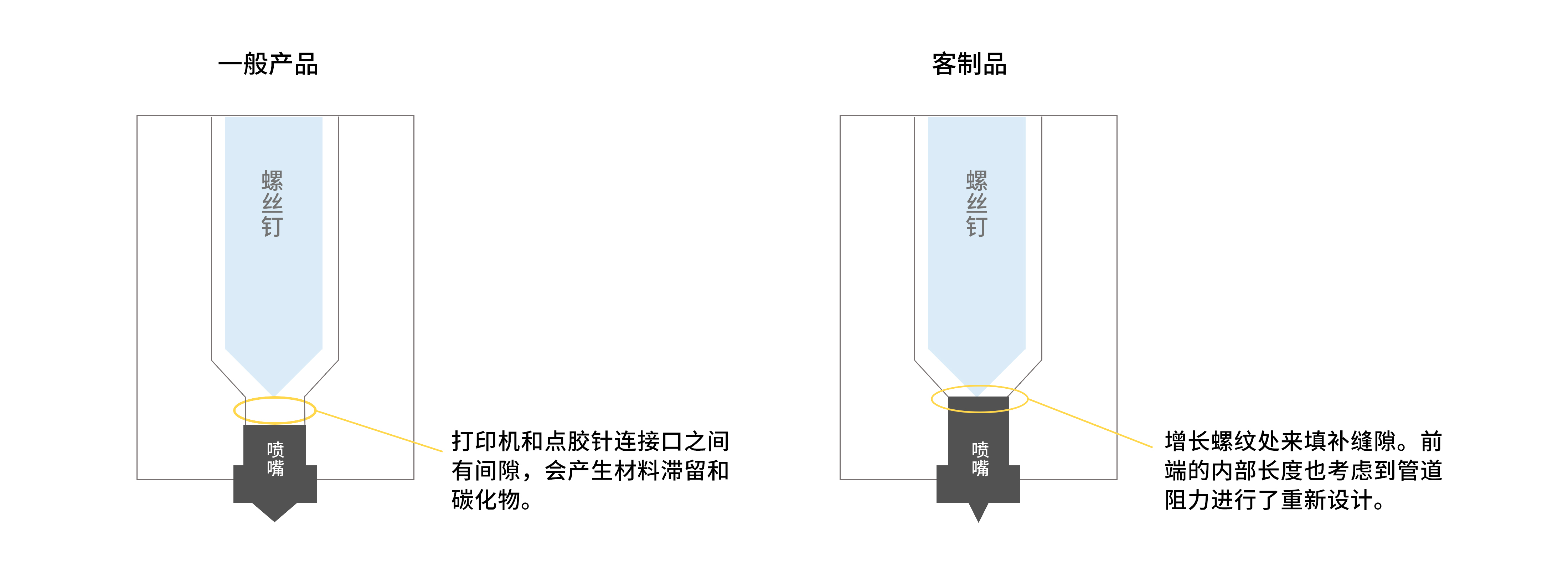 噴嘴內(nèi)部的長度在設(shè)計時考慮到了管道阻力,因此,在提高材料流動性的同時,還能有效地回縮。此外,客制的點(diǎn)膠針形狀也可填充打印機(jī)和點(diǎn)膠針連接口之間的間隙,從而減少材料滯留和碳化物的產(chǎn)生。