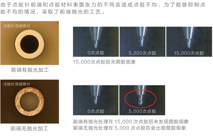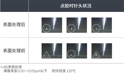 精準(zhǔn)點膠的秘訣在于抑制出膠量不均,材料拉絲,前端爬膠等現(xiàn)象,進一步實現(xiàn)高品質(zhì)的點膠。 在點膠針頭前端及內(nèi)徑進行特殊材料的表面處理,可以實現(xiàn)更精準(zhǔn)的點膠。請依照使用目的與用途來選擇表面處理的種類。