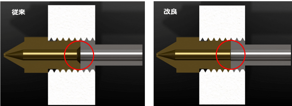 ノズル先端部の內(nèi)外徑差の端面面積をベスト値に設(shè)定。細部への吐出と同時にアイロニングに適した外形寸法を見出しました。