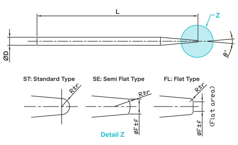 型號 | 直徑(Ф) | 前端角度(°) | 長度(L) | 前端R(μR) |